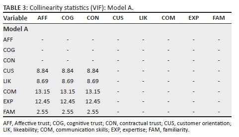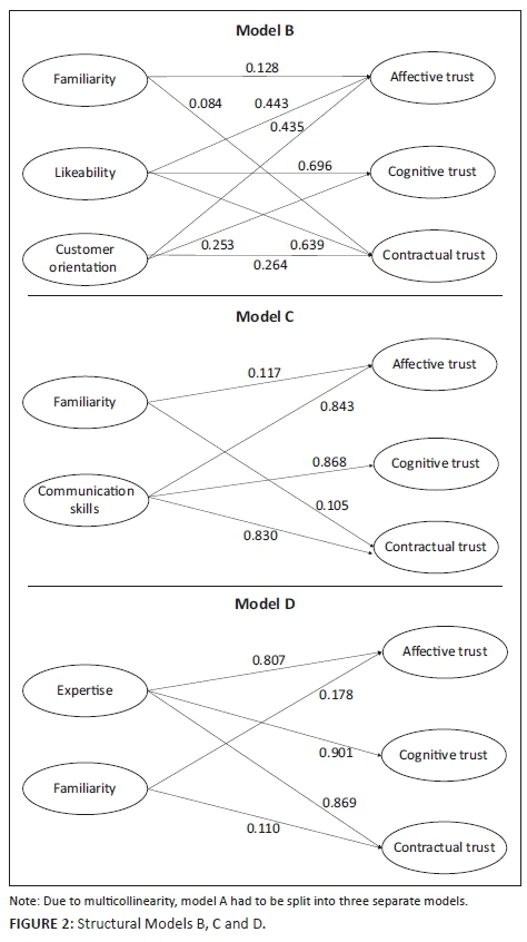 Inferential statistics were obtained from employing PLS-SEM, allowing for the assessment of the measurement (outer) and the structural (inner) models (Hair et al. 2014). Once the conceptual model (Figure 2) was assessed, it became evident that multicollinearity might be a concern. This concern was addressed by constructing three smaller models, based on the exclusion of the highly correlated independent variables. In order to achieve valid and more robust results, the same statistical techniques were applied to all three models. The initial conceptual model was labelled Model A, and the three additional models were labelled Models B, C and D. Model B hypothesised familiarity, likeability and customer orientation (the three independent variables) relative to affective, cognitive and contractual trust (the three dependent variables). Model C had familiarity and communication skills as independent variables, whereas expertise and familiarity were the two independent variables in the case of Model D.