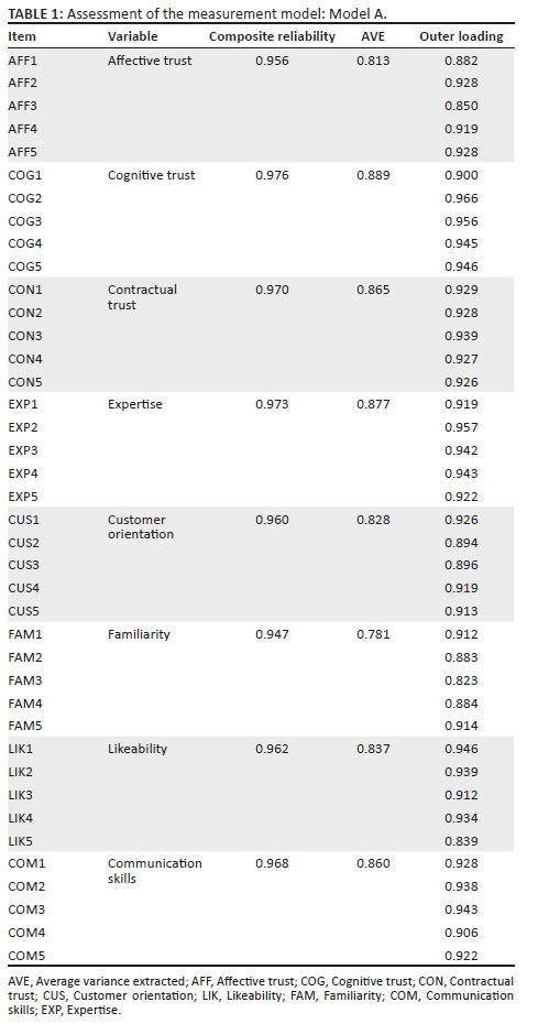The HTMT ratio confirmed the discriminant validity of the majority of the reflective constructs as most of these ratios were below 1 (see Table 2). However, in all four models the dependent variables (affective trust, cognitive trust and contractual trust) correlated too highly with each other's scales, implying that these constructs were not completely distinct from each other by empirical standards. The same correlation occurred between communication skills and customer orientation for Model A as shown in Table 3, indicating that these two constructs captured some phenomena represented by both. By excluding either one of, or both communication skills and customer orientation, discriminant validity for all the independent variables were established with an HTMT ratio below one.