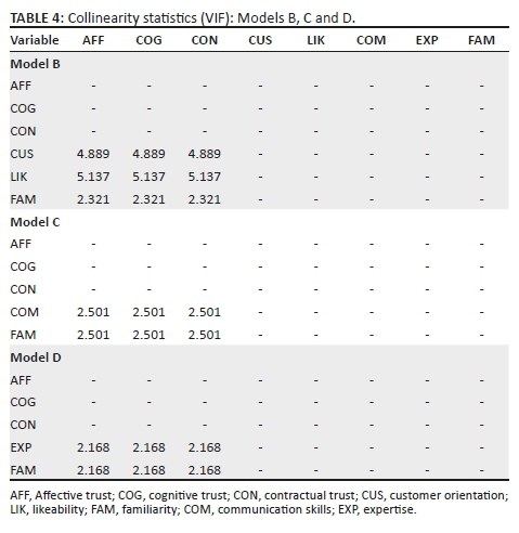Model B was created by excluding the variables that proved to have the highest VIF values, namely communication skills and expertise. As a result, the VIF values in Model B decreased significantly. Although likeability still produced a VIF value greater than five, it was only marginally so. Therefore, as likeability was only moderately correlated with the remaining variables, there was little cause for concern. Consequently, likeability and customer orientation were excluded from Model C. However, communication skills was reintroduced into the model and, ultimately, the two remaining independent variables produced satisfactory VIF values, as can be seen in Table 4. In addition, Model D was also created to assess the collinearity of the model if expertise were also to be reintroduced, but replaced communication skills in Model C. The outcome also proved to be satisfactory since the two remaining independent variables produced the lowest VIF values in comparison with the other three models.
