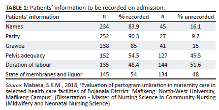 In this current study, a significant percentage of partograms had the names of patients recorded, while 45 women were in labour without their names being recorded on the partogram. Furthermore, a very high percentage of partograms had no parity and gravida indicated. Knowledge of women's parity and gravida helps midwives and doctors be on the alert when managing women in labour to identify possible risk factors to intervene appropriately to guide the management. Women who have given birth five times or more are at risk of pregnancy-labour-related complications leading to morbidity and/or mortality (Dippenaar & Da Serra 2018:242).