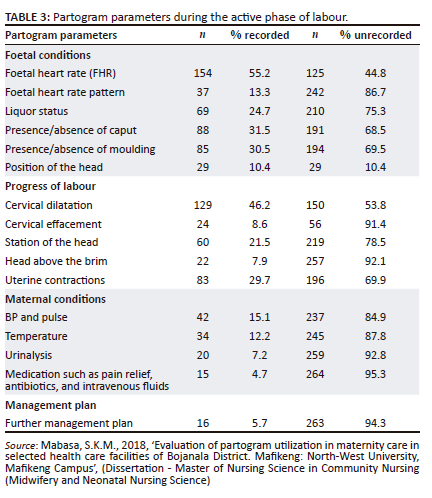 The progress of labour was only recorded with the initial assessment. This practice is of concern as the latent phase of labour is not considered until when the woman complains of severe pain and problems are not identified if the woman is not assessed at least every 4 h. Labouring women were subjected to a prolonged latent phase of labour, where 65% of plotted partograms were seen when women were in labour for more than 24 h. The progress of labour was also poorly recorded during the active phase of labour with a high percentage of recorded cervical dilatation, effacement, and station of the presenting part and extremely high unrecorded parameters. Similarly, a study conducted in Nigeria by Okusanya et al. (2018:52) confirmed a significant percentage of unplotted uterine contractions during both the latent and active phases of labour. The study also revealed a substandard recording of uterine contractions or none at all. This makes it impossible to recognise deviations from the average on the progress of labour and to identify if labour was progressing well or not for necessary interventions to be taken. Findings were consistent with Okusanya et al. (2018:52), where it was established that although a partogram was utilised, it was incompletely filled with an inadequate and substandard recording of uterine contraction specifically during the active phase of labour. In this study, it was revealed that midwives and other healthcare workers lacked knowledge on plotting cervical effacement and station of the presenting part. Maphasha et al. (2017:84) also confirmed that healthcare professionals were incompetent in plotting parameters as expected because of a lack of knowledge. A significant percentage of 55% of no recordings were seen on the station of the presenting part above the ischial spines, the level of the head to the pelvic brim, and uterine contractions. Some parameters were completed selectively or not at all in this study at all levels of care.