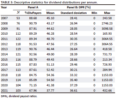 A range of measures can be used as proxies for dividend distributions. Most scholars use DPR either on its own (e.g. Aigbovo & Evbayiro-Osagie, 2022; Mans-Kemp & Viviers, 2015; Moloi et al., 2021; O'Connor, 2013) or in combination with the propensity to pay a dividend (Al-Najjar & Hussainey, 2009). The propensity to pay a dividend was included in the descriptive analysis. In line with the majority of prior scholars, DPR was used as the dependent variable to empirically investigate the hypothesised relationship between dividend distributions and board independence.