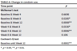 Baseline condom use data were compared with data points after 4, 8 and 12 weeks and these were also compared with each other. McNemar's tests and a Cochran's Q test were used to look for change in condom use over time. In particular, the McNemar's test was used to see if change in condom use (=condom migration) was random or because of the intervention. Data were analysed using STATA 13.0.