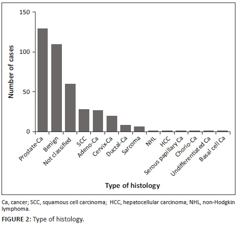 Histology was usually not performed for the bilateral orchidectomy (BLO) cases. The diagnosis of metastasised prostate cancer was therefore either based on clinical presentation and PSA levels and/or on histology provided by the patient. Two hundred and sixty-eight cases for histology were sent to Lancet Laboratories Harare. The most common findings were benign (N = 109) or not classifiable (N = 59). Including the BLO cases, prostate cancer was by far the most common malignancy, accounting for 129 cases (58.4%), followed by squamous cell carcinomas (all sites 27; 12.2%), adenocarcinoma (all sites 26; 11.8%) and cervical cancer (19; 8.6%) (Figure 2).