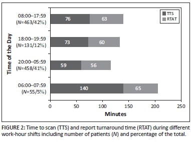 Weinberg et al.14 also evaluated the RTAT of radiology residents in trauma patients. Boland et al.15 proved that clinician incentives can reduce RTAT by almost 9 minutes in a pay-for-performance (PFP) programme. STR is the main contributor to our long RTAT because the MDCT scanning time is included. Owing to data limitations, our RTAT includes patient transfer to the MDCT scan bed and MDCT scanning time. Other studies calculate RTAT as from completion of the scan till the finalised radiology report.13,14 It is probably because of this fact that our median RTAT compares poorly to other studies. As per departmental protocol, an initial report is always phoned to the referring call doctor. Registrars are the only radiology doctors doing trauma MDCT reporting at the hospital, with consultant back-up available on-site during office hours and via tele-radiology after hours. Asking for consultant assistance prior to starting a report on the system may also contribute to the prolonged RTAT. It should be noted that consultant advice is only requested when the registrar feels unsure of his/her diagnosis. Help with patient transfer back to the trauma unit owing to lack of staff, prior to the start of the report, is a common occurrence.