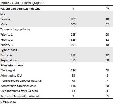 A total of 4977 patients were seen in the trauma department, 1144 of whom underwent a MDCT scan. Thirty-seven patients were excluded from the study owing to incomplete entered data and/or illegible handwriting in the trauma unit register and/or data mismatch between the trauma unit register entry and data on the RIS. Of 1107 patients included in the study, 905 patients (82%) were male, and the sample had a median age of 30 (interquartile range (IQR) 23-39) years. Most (62%) patients were triaged as priority 2 (Table 1). In all, 734 patients were admitted, 646 to a normal ward and 88 to the intensive care unit (ICU). As expected, most patients admitted to ICU were triaged as priority 1 (74%). Seventy-three (6.6%) patients were transferred to other local tertiary hospitals and one (0.01%) patient signed a refusal-of-hospital-treatment (RHT). The overall mortality rate for patients who underwent a MDCT scan but died shortly thereafter in trauma was 3.9% (Table 2).