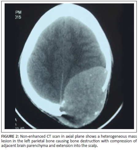 A 25-year-old male patient presented with a 6-month history of a gradually progressive, painless swelling at the back of the head associated with headache. On examination, there was a firm, non-tender, sub- cutaneous swelling in the left parieto-occipital region with normal overlying skin. No neurological abnormality was evident. Haemoglobin, blood counts, blood urea, serum creatinine and electrolytes including serum calcium were done and found to be normal. Immunoelectrophoresis for serum proteins revealed normal levels of immunoglobulins. Urinalysis for Bence-Jones proteins showed no abnormal findings. Bone marrow examination was done which did not reveal any signs of systemic myelomatosis.