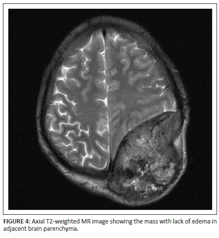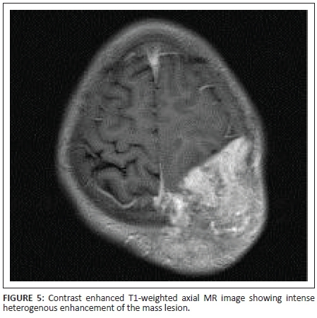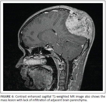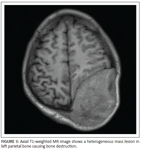 X-rays of the skull showed a well-defined lytic lesion in the left parietal bone with an associated large soft tissue component. No marginal sclerosis or periosteal reaction was noted (Figure 1a and 1b). Non-contrast computed tomography (NCCT) revealed a well-defined heterogeneous hyperdense mass lesion centred on the left parietal bone causing bone destruction, compressing the adjacent brain parenchyma and bulging into the scalp. A few small bony fragments were seen at the periphery of the lesion (Figure 2). Magnetic resonance imaging (MRI) of the brain with contrast demonstrated a well-defined heterogeneously enhancing soft tissue mass lesion measuring 8.0 cm × 7.9 cm × 6.8 cm causing destruction of the left parietal bone and bulging into the scalp. Some flow voids were seen with the mass. No restricted diffusion or surrounding oedema was noted. There was mass effect with compression of adjacent brain parenchyma and mild midline shift to the right side. The mass was compressing adjacent superior sagittal sinus but not invading it (Figures 3, 4, 5 and 6). Skeletal survey of the body revealed no other lytic lesions anywhere in the body.