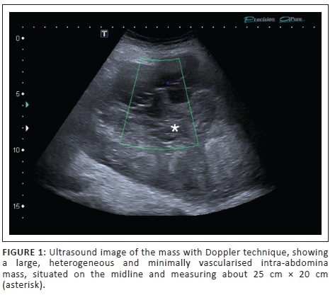 An 80-year-old female patient was referred by her general practitioner and presented at the radiology department for an abdominal ultrasound. She complained about painless abdominal swelling for several weeks. A firm intra-abdominal mass was palpable during clinical examination. The abdominal ultrasound showed a large, heterogeneous and minimally vascularised intra-abdominal midline mass, measuring about 25 cm × 20 cm (Figure 1).