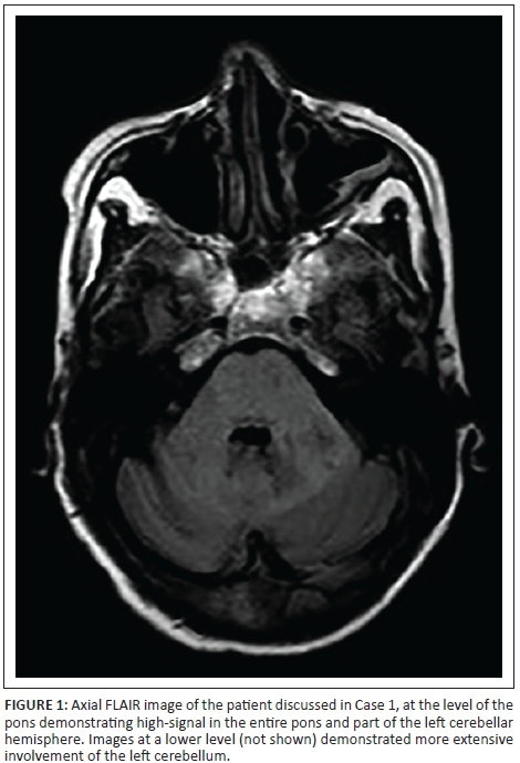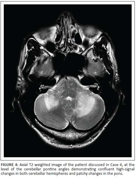 A 40-year-old HIV-positive male patient on HAART and anti-tuberculosis medication presented with 3-week history of loss of balance, dizziness and difficulty in speaking. On examination, he had ataxia, nystagmus, dysmetria and dysdiadocokinesis. His CD4 count was 167 cells/µL. MRI showed high-signal on T2-weighted and FLAIR images bilaterally in the cerebellar hemispheres with the right more involved compared with the left (Figure 3). The lesions did not demonstrate any restricted diffusion or enhancement post contrast. The CSF was not active and demonstrated no growth. The patient's anti-tuberculosis medication was continued, and the HAART was optimised. He was discharged to the rehabilitation unit.