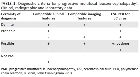 There are several studies that have demonstrated a high sensitivity and specificity of cerebrospinal fluid (CSF) polymerase chain reaction (PCR) for JC virus in PML.3 Many authorities regard the demonstration of JC viral DNA coupled with the appropriate clinical and radiologic features sufficient to be diagnostic of PML.4Table 1 summarises the diagnostic criteria for PML.4 The diagnosis can also be confirmed with tissue histopathology after brain biopsy.