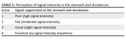 Images were assessed by two radiologists: a consultant with more than five years' experience and a senior radiology trainee. Signal intensity (SI) of the stomach and duodenum was measured on pre- and post-contrast images, using the Carestream picture archiving and communication system (PACS). A 100 mm2 region of interest (ROI) was used to assess maximum gastric SI on MIP, whilst a smaller, oval ROI was used for the duodenum. The overall perceived SI of the stomach and duodenum were recorded using a 4-point Likert scale (Table 1). The visibility of the common bile duct (CBD) and main pancreatic duct (MPD) before and after pineapple juice administration were graded qualitatively using the 4-point Likert method (Table 2).