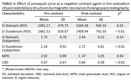 METHOD: An observational, analytical study was conducted during January-December 2017. A 1.5 Tesla MRCP sequence was performed immediately before and after ingestion of 250 mL of a local, commercially-available pineapple juice preparation. Image evaluation was performed by two radiologists with independent, blind assessment of gastric/duodenal signal intensity and biliary /pancreatic duct visibility, before and after pineapple juice.