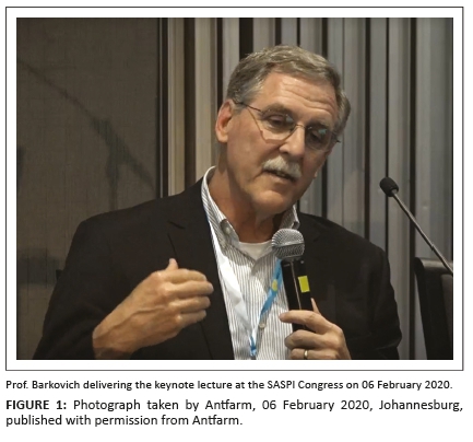 South African radiologists are fortunate that that the congress organising committee was able to persuade Prof. Barkovich to make the long journey to South Africa on two occasions (the first and third SASPI-RSSA meetings in 2012 and 2020, respectively). On both occasions he made time in his busy schedule to fly in and out of the country primarily to participate in the meetings with very little time for any personal travel or sight-seeing. His engagement with the audience is worthy of commendation and he is always happy to answer questions. The mark of greatness is the ability of a person of stature to be able to communicate equally with a training registrar as he would with a renowned fellow scientist. Prof. Barkovich was always seen chatting to attendees at our conferences irrespective of their level of training. As an incredibly modest man he serves as a role model for South African radiologists. In his laid back way he casually related to the obvious amusement of the audience, how he had used Dr Google when he came across something he had never seen before! He normalised what many of us might find ourselves doing. Apart from his excellent lectures as a keynote speaker, he contributed greatly to the stature of our meetings. Of course, many of us have been privileged to hear him speak at European and other meetings, especially through our interaction with the European Society of Neuroradiology (ESNR) over the last decade. His most recent contribution has been to act as promoter for a research project on hypoxic-ischemic injury currently being undertaken in South Africa.