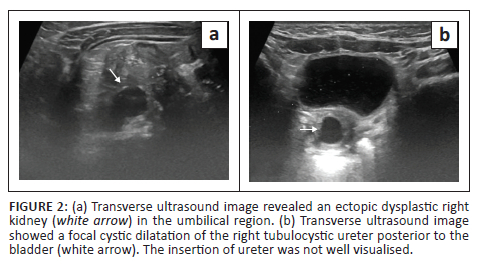 A 6-month-old female presented with complaints of continuous dribbling of urine from the vagina and occasional fevers as noticed by her mother. An ultrasound of the abdomen and pelvis was performed as the initial imaging examination and revealed an empty right renal fossa. An ectopic dysplastic kidney with cystic areas was seen to the right of the umbilical region. A dilated and tortuous right ureter was identified distal to the kidney but its insertion was not well appreciated on ultrasound (Figure 2). The left kidney was normal in position, outline and morphology, and the left ureter was undilated. Static MR urography was advised for further assessment and for evaluation of the right ureter.