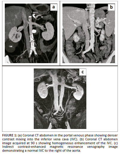 Post-contrast CT of the abdomen is the preferred and most commonly used modality for the evaluation of the IVC. The inferior vena cava is often evaluated on routine CT abdomen and pelvis, which is usually obtained in the post-contrast portal venous phase at 60 s - 70 s. However, in the portal venous phase, there is differential contrast enhancement of the renal and suprarenal IVC compared with the infrarenal portion. Venous return from the kidneys result in denser contrast in the renal and suprarenal IVC. Thus, portal venous phase imaging may result in incomplete opacification of the infrarenal IVC and may show admixture artifact. Increasing the delay time for CT image acquisition to 70 s - 90 s after intravenous contrast administration allows homogeneous opacification of the infrarenal IVC (Figure 1). With the advancement of multidetector computed tomography (MDCT) scanners, multiplanar reformation can be obtained, which is often useful in delineating IVC disease.1,2,3,4