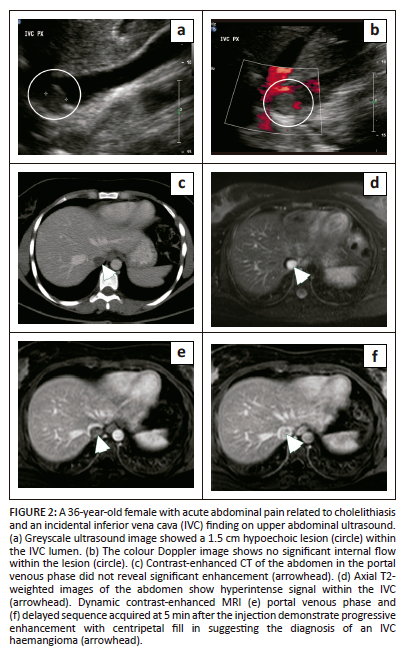 Haemangiomas at most locations demonstrate characteristic features allowing for a confident radiological diagnosis. However, they can occasionally occur at atypical sites and have atypical imaging features that pose a diagnostic dilemma and may necessitate surgical excision. Inferior vena cava haemangiomas are rare with a few reported cases in the literature.9,10 Multiphase CT or MRI are often needed for the diagnosis demonstrating an intraluminal mass within the IVC, indistinguishable on imaging from other IVC neoplasms (Figure 2).10