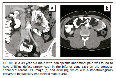 Intravascular papillary endothelial hyperplasia (IPEH) is a benign, non-neoplastic entity of intravascular origin. It is also known as Masson's tumour, intravascular angiomatosis, Masson's pseudo-angiosarcoma, and vegetant intravascular haemangioendothelioma.12 It is a rare entity that results from excessive proliferation of endothelial cells, mediated by elevated fibroblast growth factor in an attempt to recanalise a thrombosed vein. It can occur in normal blood vessels or vascular malformations.13 Intravascular papillary endothelial hyperplasia can be classified into three subtypes. The most common subtype is the pure form which arises in dilated vessels. The mixed form arises in pre-existing vascular lesions such as haemangioma, aneurysm, vascular malformation and pyogenic granuloma. The third subtype is an extravascular form, which arises within haematomas.14 It predominantly involves the skin and subcutaneous tissues of the head and neck and extremities as well as the oral cavity.15,16 Rarely, large veins such as the renal vein, external jugular vein and superior vena cava can be involved.14,17 Intravascular growth of these entities have been reported to result in obstruction leading to raised intracranial pressure18 and superior vena cava syndrome.19 To the authors' knowledge, involvement of the IVC has not been reported and the images of the patient presented likely represent the first case of IVC involvement by IPEH. Intravascular papillary endothelial hyperplasia can mimic aggressive vascular tumours such as endothelioma and angiosarcoma.20 Imaging features are not characteristic, appearing echogenic with significant vascularity on ultrasound and as homogeneous masses with intense enhancement on CT (Figure 4). On MRI, these lesions depict T1 intermediate and T2 heterogeneous hyperintense signal.21