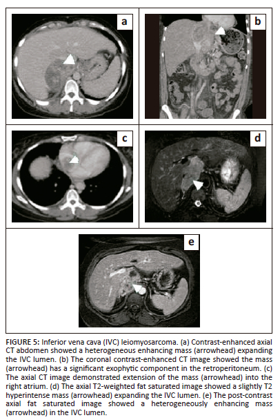 This is an uncommon malignancy, accounting for less than 1% of all malignancies. Yet, it is the most common primary malignancy involving the IVC.22 Nearly three-quarters of these tumours arising from large veins are leiomyosarcomas.2 These tumours originate from the smooth muscle cells of the vessel wall. Nearly three quarter of these cases occur in middle-aged women.23 Most leiomyosarcomas are large at presentation. They present with non-specific symptoms such as abdominal pain, a palpable mass and lower limb oedema. Inferior vena cava leiomyosarcoma initially has intramural growth, but ultimately two-thirds have extraluminal growth.24,25 Intraluminal growth causes venous obstruction while extraluminal growth results in invasion of adjacent structures. Involvement of the renal and suprarenal IVC is seen in nearly half of the patients, and is associated with a better prognosis, while intrahepatic IVC involvement seen in less than 20% of cases, is associated with a worse prognosis.2 On imaging, it appears as a mass filling the IVC with heterogeneous enhancement. Non-enhancing areas within the mass represent necrosis (Figure 5). En bloc resection of the IVC and grafting is often performed as complete surgical resection is necessary for cure. The overall outcome is poor with a 14% 10-year survival rate and 50% recurrence.1,2