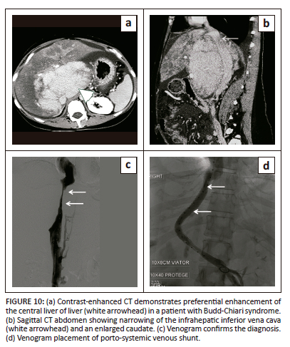 In the acute phase, arterial phase imaging demonstrates preferential enhancement of the central region of the liver, which includes the hypertrophied caudate lobe and part of the left lobe with washout of contrast in the central region and accumulation of contrast peripherally in the portal venous phase (flip-flop pattern of enhancement) (Figure 10).3