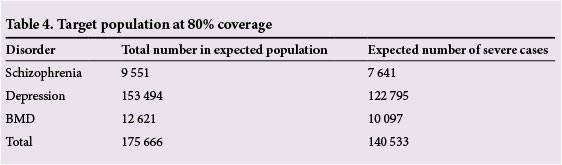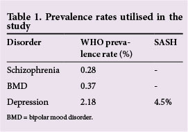 - Step 3: Prevalence rates for the three mental disorders were determined. Prevalence rates for schizophrenia and bipolar mood disorder were obtained from Scheffler et al. [12] The prevalence rate for depression was obtained from the SASH study (Table 1).[5] These prevalence rates were utilised to determine the expected number of cases in the entire population (prevalence rate x total population). The WHO has set a target coverage of 80% for schizophrenia and bipolar mood disorder for low-to-middle-income countries.[12] Although the target coverage for major depression was set at 33% by the WHO, the authors increased this to 80%, as the condition is easily managed at primary healthcare level. Utilising this target coverage, the expected number of severe cases was estimated.