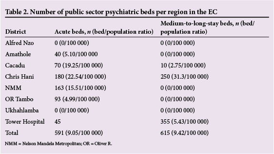 This study provides the first detailed estimates of human resource and bed deficits and excesses in the EC. The analysis conducted here provides provincial policymakers with an understanding of the regions within the province with the greatest need for mental health services. This article allows for the planning and equitable redistribution of beds and human resources to meet the requirements for an efficient mental health service as set out in SA's national mental health policy framework and strategic plan.[18]