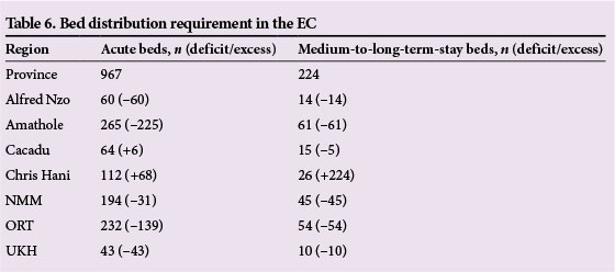 The EC had a utilisation rate of 0.02/ person/year and daily patient visits were estimated at 209 persons/day. Table 6 shows bed requirements for acute, medium- and long-stay beds provincially and per region.