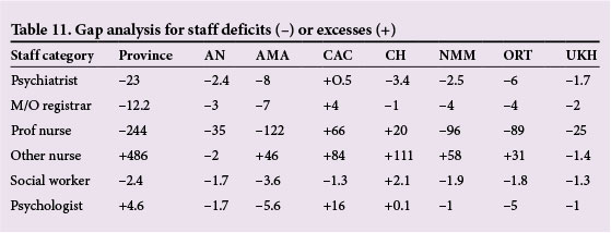 METHODS: Data from previous research conducted in the province, and international and national epidemiological studies were utilised to quantify the requirements for human resources (psychiatrists, medical officers/registrars, psychologists, nurses, occupational therapists and social workers) and beds for acute, medium-to-long-stay and ambulatory services at provincial and regional levels, to provide mental healthcare. The authors focused on three of the eight priority conditions set by the World Health Organization. A target coverage rate of 80% was used in all calculations. A gap analysis was conducted to demonstrate deficits and excesses, utilising available data on human resources and beds available in the province.