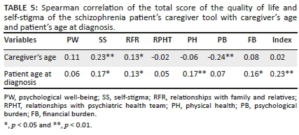 The SS, RFR and PB domains scores significantly correlated with the study caregiver's age 0.23, 0.13 and -0.24, respectively. The patient age at diagnosis of schizophrenia had also significant correlation rs = (0.13-0.23) with SS, RFR, PH, FB and the index (See Table 5).