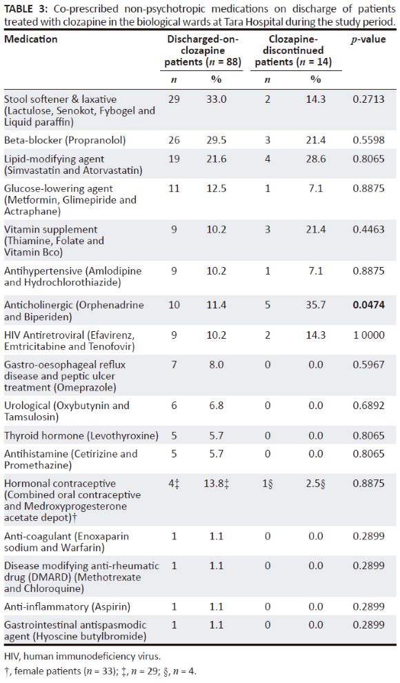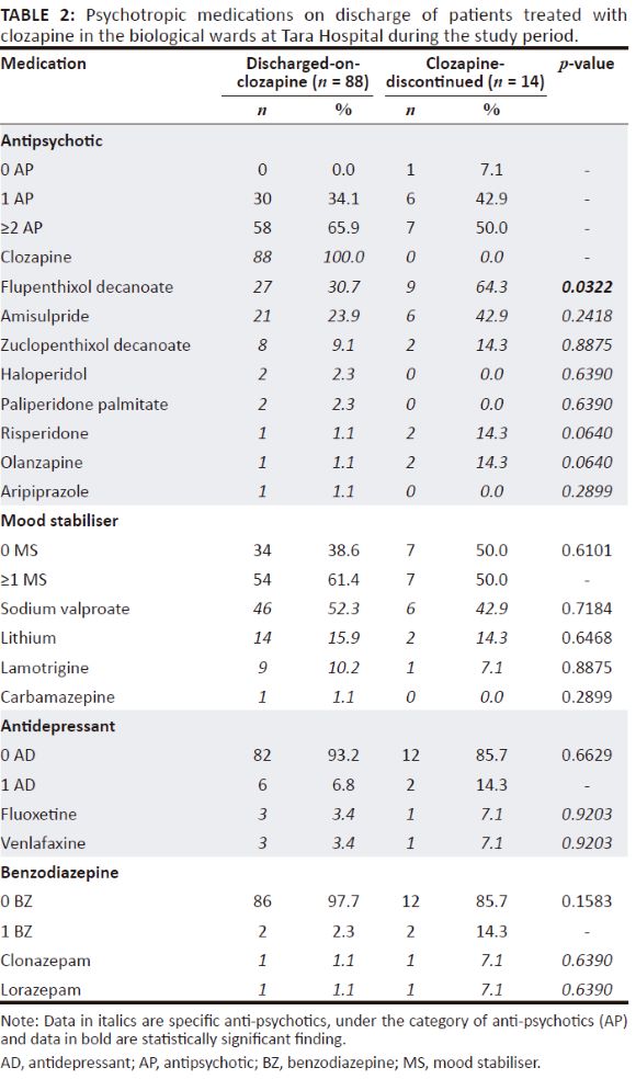The total number of medications on discharge was high in both groups, those discharged on clozapine (mean 4.5; range 1-9) and those in whom clozapine was discontinued (average 4.1; range 1-8). According to the Chi-Square test, this was not significant (p = 0.1801). Details regarding co-prescribed psychotropic and non-psychotropic medications are shown in Table 2 and Table 3. The frequency of flupenthixol decanoate prescriptions was significantly higher in the clozapine-discontinued group as opposed to the discharged-on-clozapine group (64.3% vs. 30.7%; p = 0.0322) and similarly with regard to the frequency of anticholinergic prescriptions (35.7% vs. 11.4%; p = 0.0474). Of the 88 patients (86.3%) who remained on clozapine at discharge, the median total daily dose of clozapine was 350 mg, with an interquartile range (IQR) of 250 mg-450 mg, and maximum dose of 575 mg. Male clozapine doses did not follow a normal distribution, and as such, we report on the median dose as 225 mg, with an IQR of 125 mg-400 mg (maximum dose was 575 mg). Female clozapine doses did follow a normal distribution, with a mean dose of 260 mg, a range of 25 mg-575 mg, and s.d. of 155 mg. Almost half of the patients were on clozapine split-dosing schedules (n = 37; 42.0%), of which 7 were female (24.1%) and 30 were male (50.8%), which was statistically significant (Satterthwaite method Pr > |t| 0.0012).