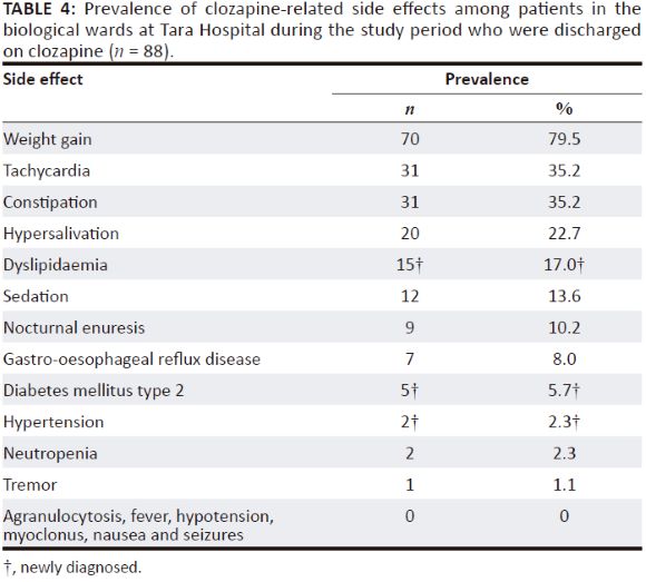 Side effects are shown in Table 4. The most frequently documented side effect of clozapine was weight gain, followed by tachycardia and constipation.