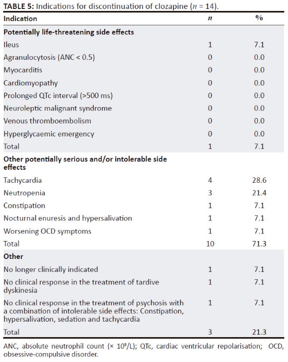 The rate of clozapine discontinuation in this study was relatively low (13.7%); however, only in-patient discontinuations were reviewed. A retrospective medication utilisation review, performed in the Eastern Cape, of a small cohort of patients discharged on clozapine found discontinuation rates of 29% and 35% at 3 and 6 months, respectively.24 Worsening of obsessive-compulsive symptoms, found in one clozapine-discontinued patient in this study, is a rare side effect that has been found to be associated with clozapine, as well as with other atypical antipsychotics.40 Only one patient had a potentially life-threatening side effect, namely ileus, which was resolved upon medical management and discontinuation of clozapine. There were no fatalities. Clozapine doses in this study were all less than the maximum licenced dose for clozapine.15