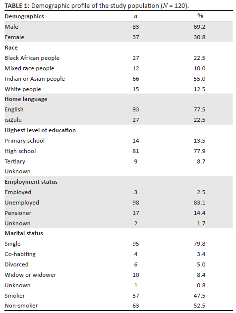 A total of 120 clinical records were reviewed. The majority of the patient samples were black African people, mixed race people and Indian or Asian people (87.5%), predominantly male (N = 83; 69.2%), with the mean age of the total sample being 43.97 years (s.d. ± 14.22) and a median of 43.0 years. The demographic profile of subjects is summarised in Table 1. The highest level of education (HLOE) was high school (N = 81; 77.9%), with the majority (N = 72; 88.9%) having not completed matric (Grade 12) and nine (7.5%) having completed tertiary education; there was also a high unemployment rate of 98%; and 95% of the sample were single.