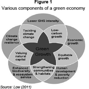 'Green' growth is a relatively new term, and is associated with an economy whose growth strategy incorporates environmental, economic and social objectives (Low, 2011:1). Environmental objectives would include lowering greenhouse gas intensity, maintaining biodiversity and the integrity of ecosystem services, and increasing climate change resilience. Economic objectives would include increasing the economic growth rate and boosting capacity in less productive areas. Finally, social objectives would include raising the level of human development and reducing poverty. These environmental, economic and social objectives are shown as the medium grey segments in Figure 1, while green growth is depicted as the dark star in the centre. The light grey segments each represent the intersection between two of the broader environmental, economic and social objects.