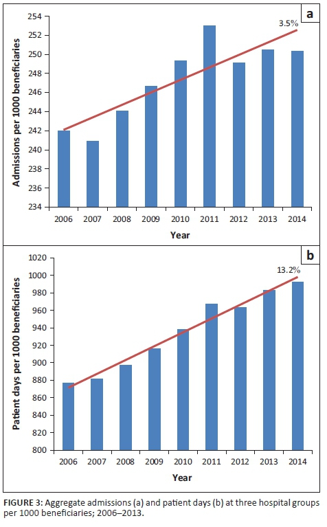 RESULTS: It is found that over time medical scheme beneficiaries, on average, are being admitted to private hospitals more frequently, as well as staying in hospital for longer during each admission. The data also indicate that over time older people are being admitted to hospital more often.