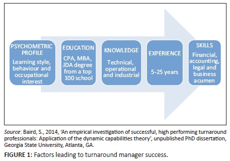 Baird (2014:83) undertook research to identify the characteristics of high performing, successful turnaround management professionals. He sought to expand on the work of the turnaround industry which identified knowledge in the areas of accounting, finance, legal and business acumen and, coupled with experience, as characteristics of successful turnaround practitioners (Turnaround Management Association [TMA] 2012, cited in Baird 2014:4). The initial survey conducted with presidents of turnaround organisations identified the following characteristics as important measures of success in relation to a turnaround management professional (Baird 2014:85):