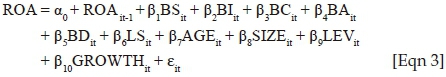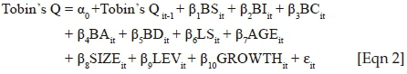 where Yit measures company performance indicators, return on asset (ROA) and Tobin's Q, Yit-1 represents the performance lag of one year. BSit, BIit, BCit, BAit, BDit and LSit are corporate governance variables, namely board size, board independence, presence of key board committees, board diversity and leadership structure respectively, of company i at period t. AGE, SIZE, Leverage (LEV) and Growth (G) are used as control variables for company age, company size, leverage and growth prospects. The intercept is α0, the error term is ɛit and α1 is the unknown estimated coefficient. The following models are thus used for the entire period (2002-2014), pre-financial crisis (2005-2007), during the crisis (2008-2010) and post-financial crisis (2011-2013), for the whole sample as well as for each industry.