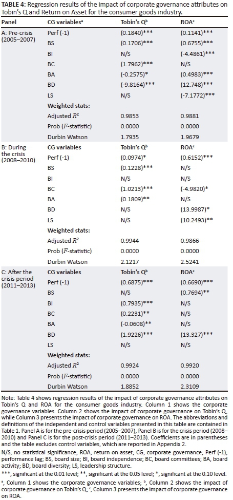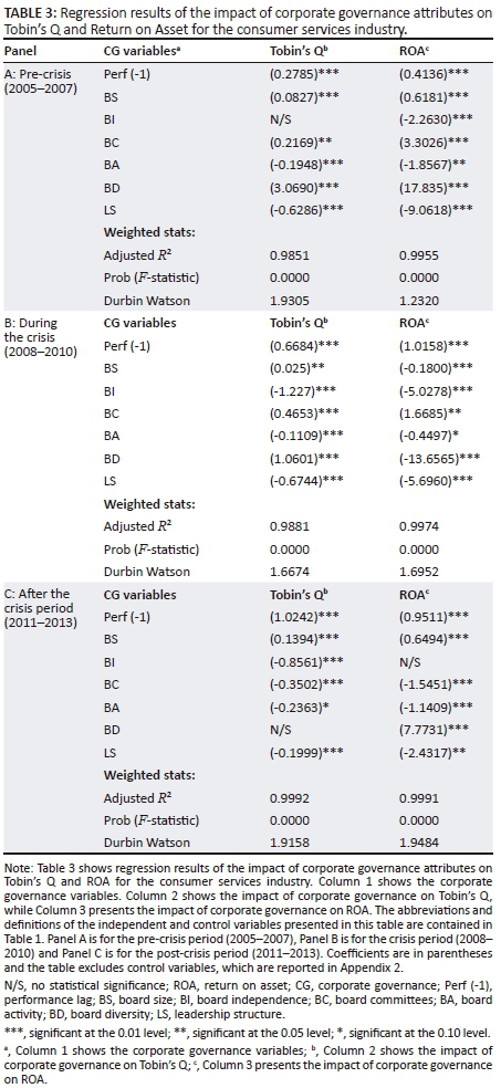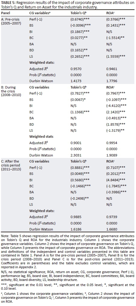 Appendix 2 presents the descriptive statistics for the financials industry. Notably, the descriptive statistics reveal that both performance measures, Tobin's Q (ROA) dropped from 1.544 (2.355) (pre-crisis) to 0.984 (2.304) (during the crisis) but recovered again after the crisis to 1.097 (3.578). This demonstrates the significant decline in company performance as a result of the financial crisis. The recovery after the crisis indicates the resilience of the financials industry to the aftermath of the global financial crisis. Notably, ROA was higher (3.578) after the crisis than it was before the crisis (2.355) and during the crisis (2.304), implying that the increased corporate governance compliance levels may have acted as a hedging mechanism for the South African financials companies as concluded in the study of Tshipa et al. (2018b).