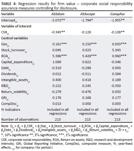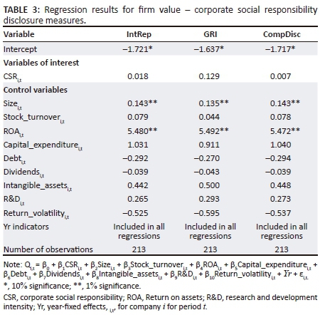 We conduct an analysis to evaluate whether higher levels of CSR reporting are associated with firm value (using Tobin's Q as measure of firm value) of large South African companies. We argue that managers have an incentive to provide higher levels of CSR disclosure to enable better prediction of future cash flow and future profitability associated with the future competitive advantage obtained through their CSR activities (Clarkson et al. 2013). We further argue that increased CSR disclosure will reduce information asymmetries between managers and shareholders, which will increase firm value. Therefore, CSR disclosure levels are expected to be positively associated with firm value (H1). Companies (managers) may choose to obtain third-party assurance of their CSR reports either to signal credibility to the market, or to mask credibility issues from the market. Inconsistencies in the assurance market may; however, limit the effect assurance has on enhancing the credibility of the disclosure (Deegan et al. 2006). Therefore, no expectations are formed with regard to the direction of the association between the CSR assurance measures and firm value (H2).
