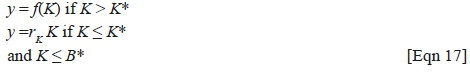The capital stock is chosen so that f'(K) = r if B* > K*. If B* ≤ K*, that is, the borrowing constraint is binding, then the entrant is indifferent between different levels of capital, since capital has a zero profit when 0 < K < K* - hence, one can expect no investment to occur. Thus, one could argue that those potential entrants whose borrowing constraint is lower than the minimum scale capital, B* ≤ K*, will not enter the secondary sector, and will move to unemployment. The proportion of potential entrants for whom B* > K*, will be defined as θ.