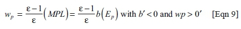 with MPL being the marginal product of labour and ε the elasticity of product demand in a monopolistically competitive market, thus (ε - 1)/ε < 1, where ε > 1 to ensure that firms make a profit. MPL is defined as a negative function, b, of primary sector employment, Ep. Thus, holding ε constant, the primary sector wage becomes a negative function, g, of primary sec-tor employment: