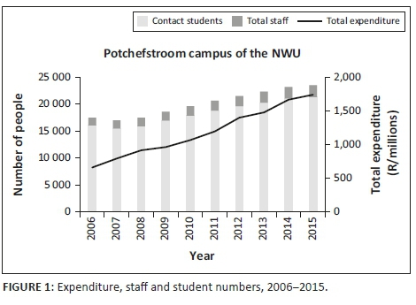 The Potchefstroom campus has significant purchasing power. In 2006 the campus spent approximately R659 million on operational and capital expenses, which had increased to R1.75 billion by 2015 (NWU 2016). Between 2006 and 2015, the total number of students increased from 16 079 to 21 320 (NWU 2018). Figure 1 illustrates the increase in expenditure and staff and student numbers on the campus during this period.