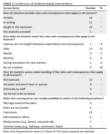 When queried on the types of intervention that were used to prevent problem behaviours, the most prevalent approaches reported by respondents focused on threats or the implementation of negative consequences, including staying after school or in class during break time. Only seven respondents utilised praise or reinforcement as an approach to preventing misbehaviour. When misbehaviour did occur, there was little consensus on how to respond. Responses were most commonly to impose negative consequences, and the most frequent response, noted by seven members of staff, was to send the learner to the principal and contact the parents. Clearly, there is a disconnect between evidence-based interventions and respondent approaches to prevent and address misbehaviour. Additional research is needed to understand whether approaches are based on a lack of staff understanding of basic principles in behaviour management (e.g. Topkins, Roman & Mwaba 2015) or on their beliefs in the effectiveness of negative consequences.