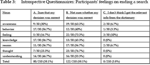 The results of the introspective questionnaire showed that the use of a dictionary did not seem to be very helpful in participants' article selection and countability judgment processes. For five out of the seven target nouns, there were many more dictionary consultations which ended with participants not being sure whether their decisions were correct than the number of dictionary consultations with participants feeling sure that their decisions were correct. In total, only after 38.1% of the consultations (n= 210) were participants sure of their decisions, whereas over 58.1% of the dictionary consultations ended with participants feeling unsure about the correctness of their decisions, and the rest (3.8%) ended with participants feeling that they didn't get the relevant information from the dictionary consulted. The difference between these two feelings was statistically significant (Z= 10.35) (see Table 3).
