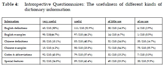 - Answers to the open-ended questions were tabulated and emerging patterns about the participants' problems in using dictionary information and/or strategies employed for problem solving, etc. were identified. The examples, definitions and/or other dictionary information which the participants based their decisions on were referred to when necessary. No quantitative analyses of the open-ended questions were done, as there was no attempt to compare learner problems and/or strategies.