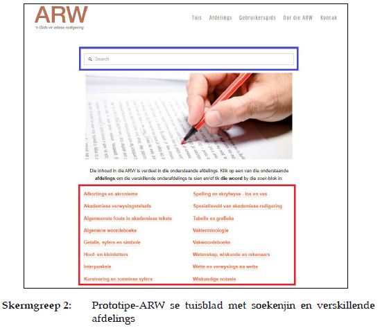 Die uitleg van die tuisbladsy is eerstens in ooreenstemming met die beginsel oor duidelikheid en netheid ontwerp, aangesien die wit agtergrond in skermgreep 9 dit vir die redigeerders makliker maak om die swart en oranje letters te lees, terwyl die hoof- en kleinletters, en vetdruk en kursief die belangrike data vir die gebruikers uitlig (Blom 2021: 83). Verder bevat die tuisbladsy in skermgreep 9 'n hoofspyskaart (omkring in blou) met skakels na "tuis", "afdelings", "gebruikersgids", "oor die ARW" en "kontak", asook interaktiewe blokke na verskillende gebruikersgidse in die prototipe-ARW (omkring in rooi) en 16 interaktiewe afdelings (omkring in groen), wat die redigeerders kan help met beheerbaarheid en diskrimineerbaarheid sodat hulle na bepaalde woordeboekdele van die prototipe-ARW kan beweeg.