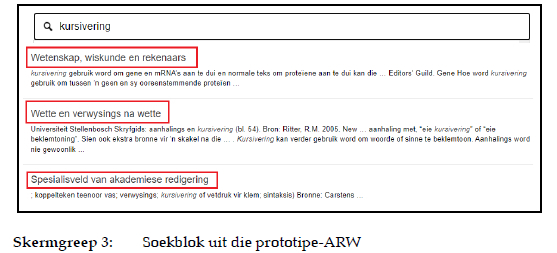 In die prototipe-ARW word daar onderskei tussen eksterne en interne toegangstrukture, wat lei tot eksterne en interne soekroetes om by spesifieke inskrywings in die prototipe-ARW en buitetekste uit te kom. Die prototipe-ARW steun hoofsaaklik op die woordeboek se soekenjin as eksterne toegangstruk-tuur, en hierdie toegangstruktuur bied hoofsaaklik twee eksterne soekroetes na 'n spesifieke woordeboekartikel. Die redigeerder kan eerstens 'n woord/frase in die soekblok op die tuisbladsy (sien skermgreep 2) intik, waarna 'n lys resultate met die bewerking van die soekopsie in verskillende afdelings van die prototipe-ARW verskyn (sien skermgreep 3). Die redigeerder kan dan op 'n spesifieke afdeling klik om hom/haar na die verlangde woordeboekartikel te lei. Vervolgens kan die redigeerder ook op een van die afdelings op die tuisbladsy klik (sien skermgreep 2) en deur 'n alfabetiese lys lemmas vir daardie spesifieke afdeling blaai om by die verlangde woord uit te kom. Die akademiese redigeerder wat vertroud is met die ARW sal, soos Gouws (2018d:45) noem, sommige fases in die eksterne toegangsproses kan oorslaan, en dadelik op die relevante afdeling klik, terwyl die redigeerder wat nie die ARW ken nie, deur al die stappe in die eerste eksterne soekroete moet gaan voordat hy/sy by die verlangde artikel uitkom.