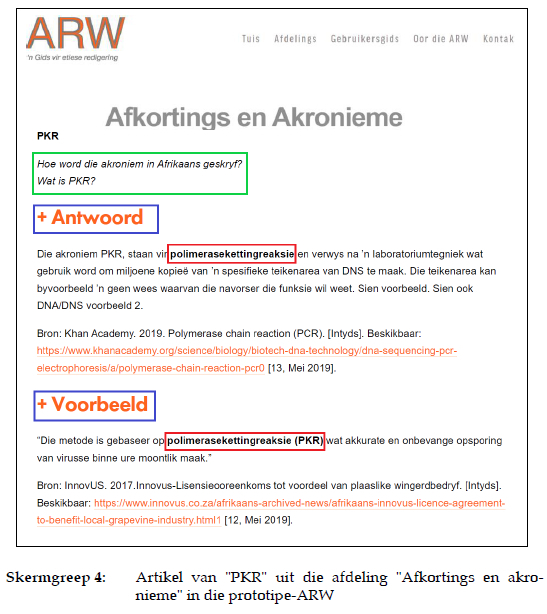 Die artikelstruktuur in die prototipe-ARW bied, soos Gouws (2014a: 164) voorstel, 'n dinamiese data-aanbod wat uit veelvoudige lae bestaan, en drie strukturele komponente, naamlik teksgedeeltes, kommentaartipes en soek-sones (Gouws 2014a: 160) bevat. Die teksgedeeltes in die prototipe-ARW se woordeboekartikels kan verder tussen aanduiders en struktuurmerkers onderskei word (Gouws 2014a: 161). Die aanduiders in die ARW is datadraers waaruit die akademiese redigeerder spesifieke inligting oor die woordeboekonderwerp kan onttrek. Die "antwoord" vir die akroniem PKR in skermgreep 4 is byvoorbeeld 'n aanduider, aangesien die redigeerder inligting oor die akroniem uit hierdie inskrywing kan onttrek.