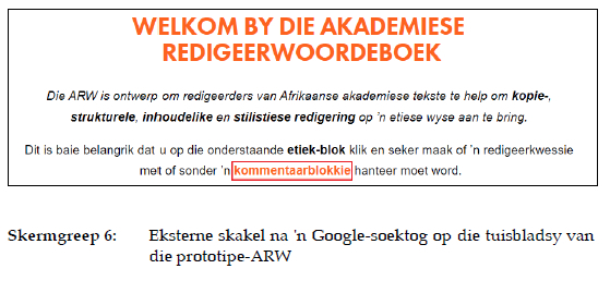 Wiegand en Gouws (2013: 113) definieer die soekroete na buitetekste ook as deel van die eksterne toegangstruktuur. In die prototipe-ARW word verskeie buitetekssoorte gebruik, byvoorbeeld 'n eksterne skakel (sien die rooi blok in skermgreep 6) na 'n Google-soektog oor hoe om 'n kommentaarblokkie in 'n Microsoft Word-dokument te voeg.