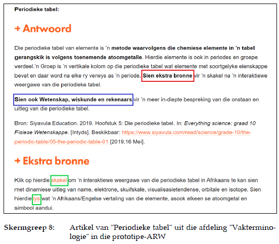 Die medio- of kruisverwysingstruktuur word in die prototipe-ARW gebruik om, soos Gouws en Prinsloo (2005: 177) voorstel, die data toegankliker vir die akademiese redigeerders te maak en 'n verhouding tussen die woordeboek-komponente in die prototipe-ARW te vestig. Die kruisverwysings in die prototipe-ARW neem die redigeerders meestal direk deur middel van hiperskakels (in swart en oranje) na die interne of eksterne kruisverwysingsadres. In skermgreep 8 neem die kruisverwysingsinskrywing, "Sien ekstra bronne" (omkring in rooi), die redigeerder vanaf die kruisverwysingsposisie, "Antwoord", na die interne kruisverwysingsadres, "Ekstra bronne". Die redigeerder word ook deur middel van die kruisverwysingsinskrywing, "Sien ook Wetenskap, wiskunde en rekenaars" (omkring in blou), vanaf die kruisverwysingsposisie, "Ant-woord", na die eksterne kruisverwysingsadres, naamlik 'n ander afdeling in die woordeboek (in hierdie geval "Wetenskap, wiskunde en rekenaars") geneem. Die kruisverwysingsinskrywings, "skakel" en "lys" (omkring in groen), neem die redigeerder na woordeboekeksterne kruisverwysingsadresse, wat in hierdie geval 'n webwerf met 'n interaktiewe weergawe van die periodieke tabel en 'n meertalige lys van die elemente is. Hierdie kruisverwysingstruktuur in die prototipe-ARW maak dit dus moontlik om verskillende datatipes met mekaar te skakel, en die skakels na woordeboekeksterne webwerwe of naslaanbronne ver-wys die redigeerders na die groot naslaanruimte van die internet (Blom 2021: 72).